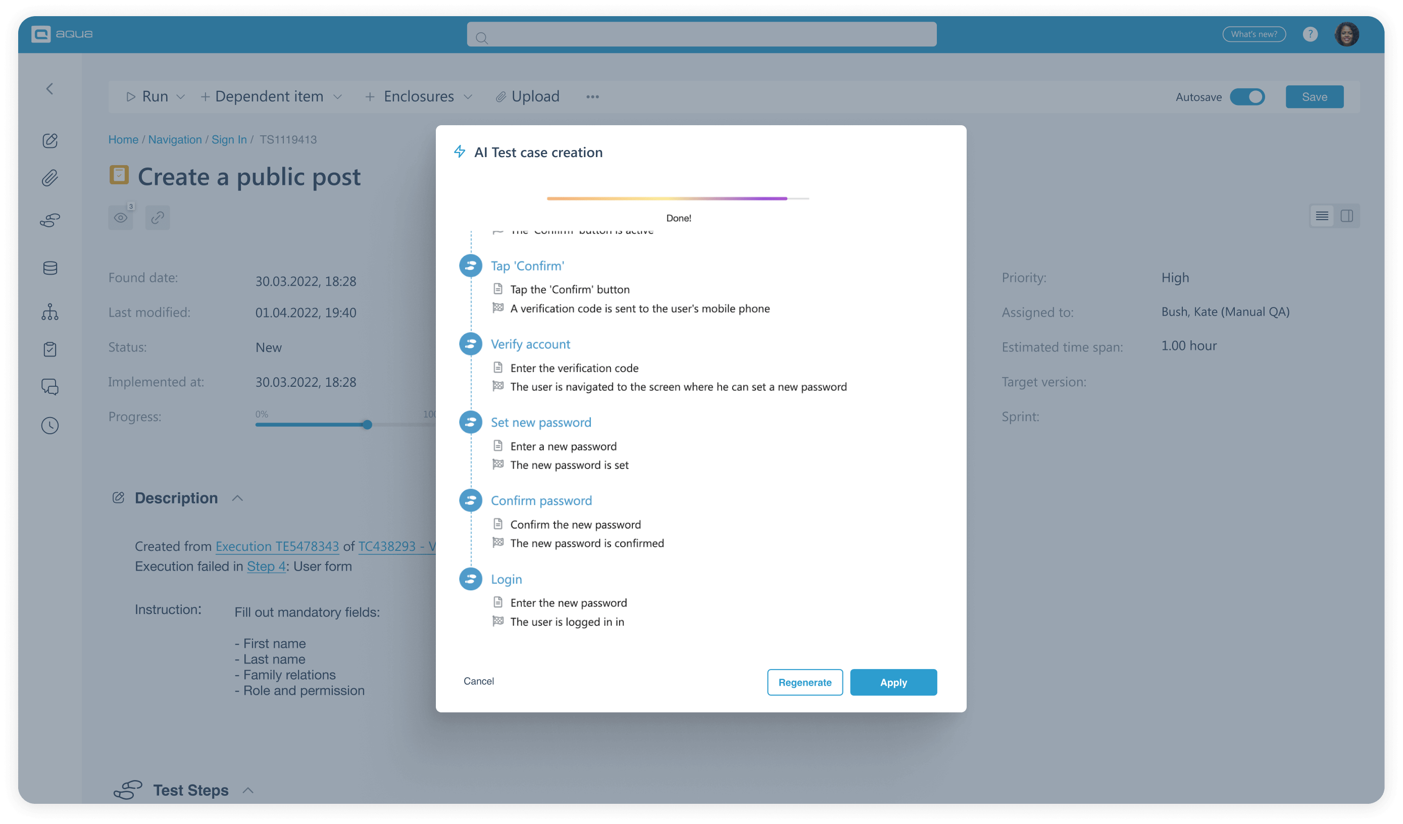 Create requirements, test cases, and test data in 3 clicks from any type of input: brief notes, voice prompts, or draft visuals. All in one 100% centralised test management platform with deep reporting and powerful automation integrations. Get your testing done in seconds, not days